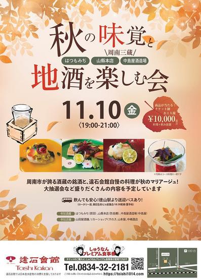 山口県周南市にある3つの蔵の日本酒を楽しむ「秋の味覚と地酒を味わう会」が11月10日(金)午後7時から、同市の結婚式場、遠石会館で開かれる。 はつもみぢの「...