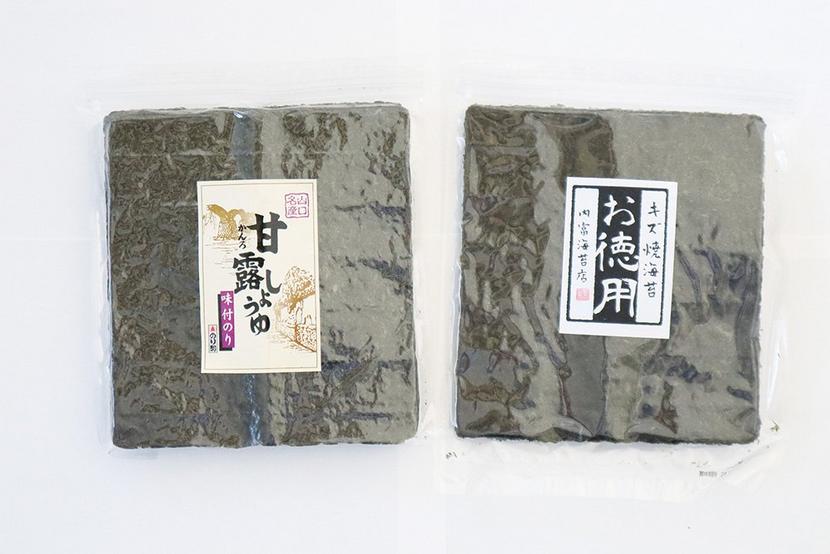 甘露しょうゆ味付け海苔(左)とキズ焼き海苔