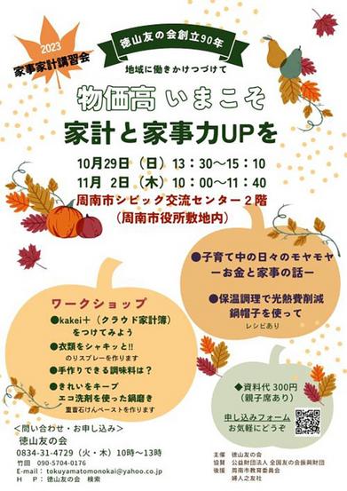 山口県周南市の徳山友の会が29日(日)、11月2日(木)、周南市役所のシビック交流センター2階で「物価高 いまこそ家計と家事力UPを」と題した家事家計講習講座...