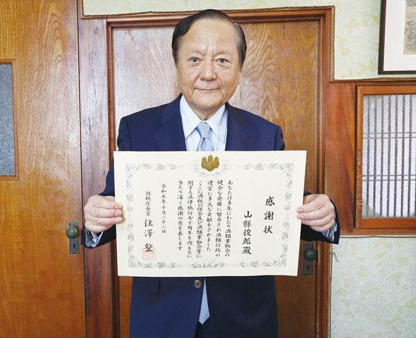 山口県周南市久米の酒蔵、㈱山縣本店の山縣俊郎社長(75)が10月23日、酒類業組合の健全な発展への貢献を称えられ、国税庁長官から感謝状を贈られた。 酒類業組...