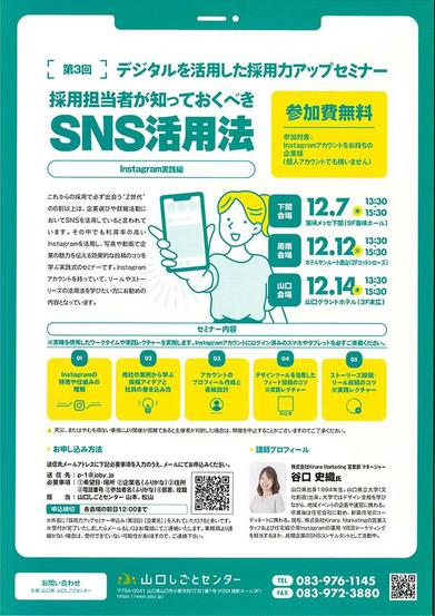 インスタグラムを活用して写真や動画で自社の魅力を伝える方法を学ぶ「デジタルを活用した採用力アップセミナー」が12日(火)午後1時半から、周南市のホテルサンルー...
