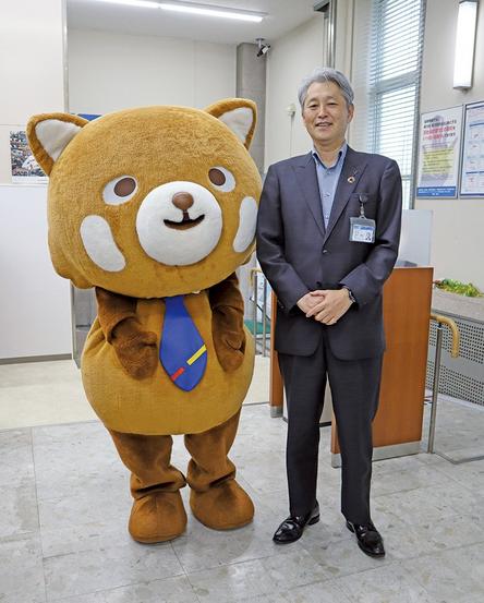 70周年を喜ぶ中井支店長とマスコットのひろくん