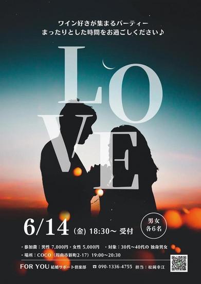 山口県周南市新町のレストランCOCOで6月14日(金)午後7時から8時半まで、ワイン好きが集まるパーティー「LOVE」が開かれる。 募集人数は30代から40...