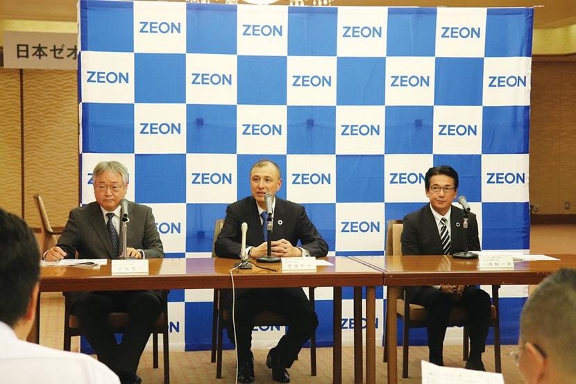 左から宮城孝一徳山工場長、豊嶋社長、小西裕一郎取締役常務執行役員(日本ゼオン提供)