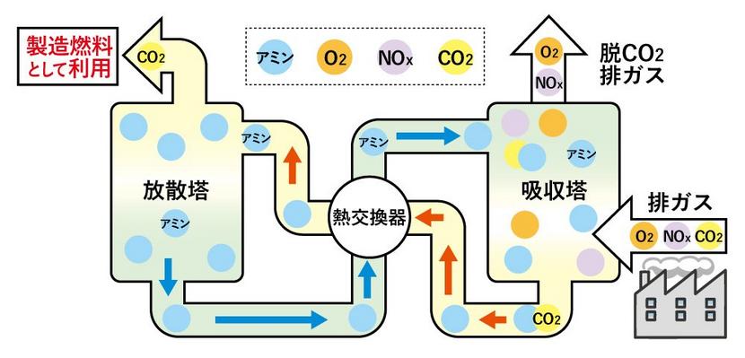 吸収塔と放散塔の2塔式循環型装置で成るこの新設備では、同社が開発した高耐久性CO2回収アミンを用いることで、CO製造過程で発生する燃焼ガス中のCO2を回収し、CO原料として再利用する。