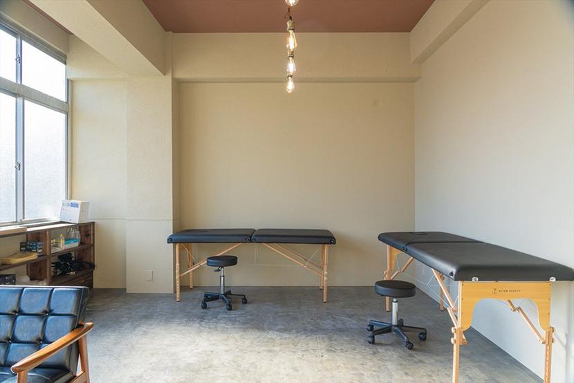 2階部分はシャンプー台とカット席が2つずつ、大きな全身鏡、充実した収納スペースなどの設備が揃う46.3平方メートルの「Room:A」と、マッサージなどに使える施術ベッドやソファーなどがある23平方メートルの「Room:B」の2部屋で、共有スペースにはトイレや洗濯スペースもある。