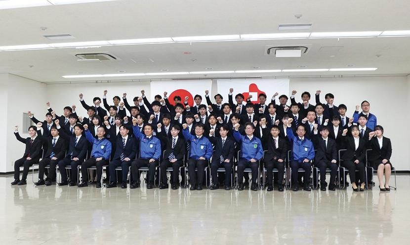 式終了後には、右こぶしを天に突き上げ記念撮影を行い、緊張していた新入社員たちもほほを緩ませる和やかな雰囲気で式を締めくくった。