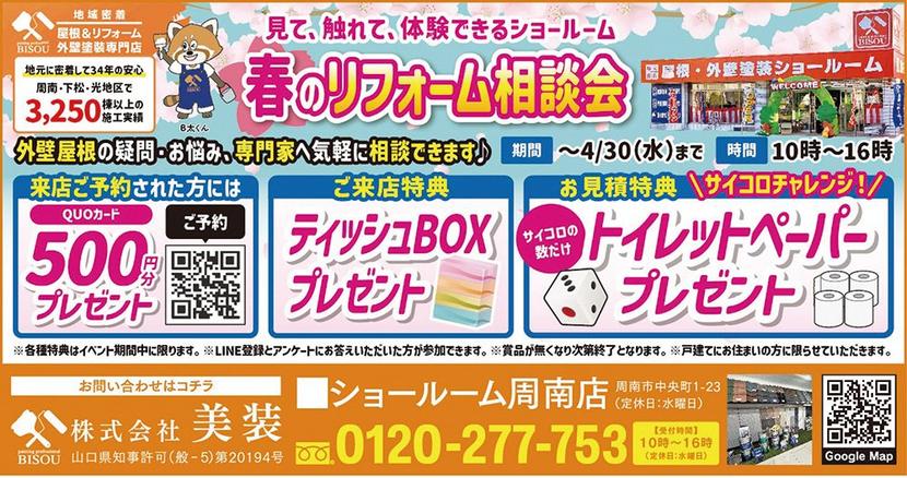 周南市西松原に本社を置く㈱美装が、中央町のショールームで戸建てに住んでいる人を対象に11日(金)から30日(水)まで「春のリフォーム相談会」を開く。午前10時...