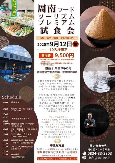 周南市内を回って地域の食と文化の魅力を体験する「周南フードツーリズム プレミアム試食会」が9月12日(金)に開かれる。事前予約制で、参加費は9,500円。10...