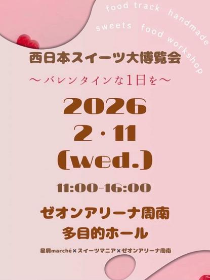 周南市のゼオンアリーナ周南多目的ホールで11日(水・祝)、甘い香りに包まれる食イベント「西日本スイーツ大博覧会〜バレンタインな一日を〜」が開かれる。県内外の出...