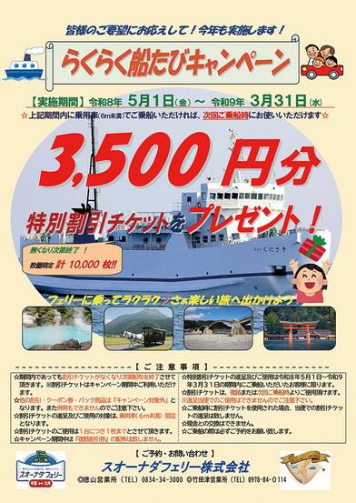 周南市の徳山港と大分県の竹田津港をフェリーで結ぶスオーナダフェリー(周防灘フェリー㈱)が5月1日(金)から来年3月31日(水)まで、毎年好評の「らくらく船旅キ...