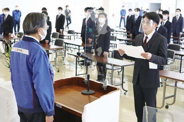 ㈱トクヤマの新入社員入社式が1日、山口県周南市御影町の徳山製造所で開かれた。高卒社員36人が出席し、大卒社員35人と高専卒社員9人は自宅からオンラインで参加し...