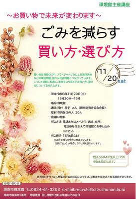 周南市の臨海町の環境館主催の講座「お買い物で未来が変わります〜ごみを減らす買い方・選び方」が20日(土)午後1時半から同館で開かれる。 講師は市消費者協会会...