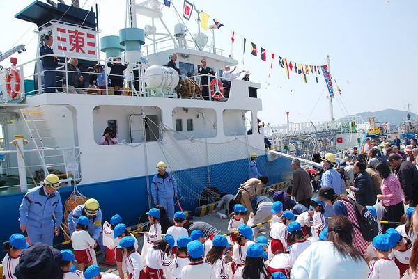 周南市富田の海運業、東阿海運(沢重敏郎社長)が東ソーの苛性ソーダを輸送するための新船「東希丸」が完成し、14日、平野ふ頭で地元住民ら約200人を招いて餅まきな...