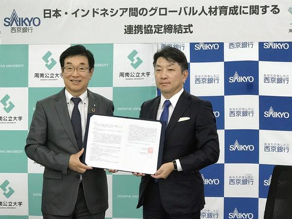 山口県周南市平和通に本店を置く西京銀行(松岡健頭取)と同市学園台の周南公立大(髙田隆学長)は5日、「日本・インドネシア間のグローバル人材育成等に関する連携協定...