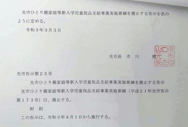 光市は合併前の1966年から54年間続けてきた、ひとり親家庭の新入学児童へのランドセルの贈呈を、今年度を最後に廃止する。松村雄之福祉保健部長は「廃止は残念だが...