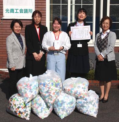 光市の武田薬品工業光工場(藤原英喜工場長)で従業員約800人が2年がかりで集めたペットボトルのふた(エコキャップ)約250キロが21日、光商工会議所女性会(道...