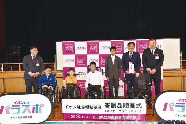 イオングループ各社が加盟・運営しているイオン社会福祉基金から、周南市久米の周南総合支援学校(古川智也校長)に電動車いすと、パラスポーツの「ボッチャ」の用具のセ...