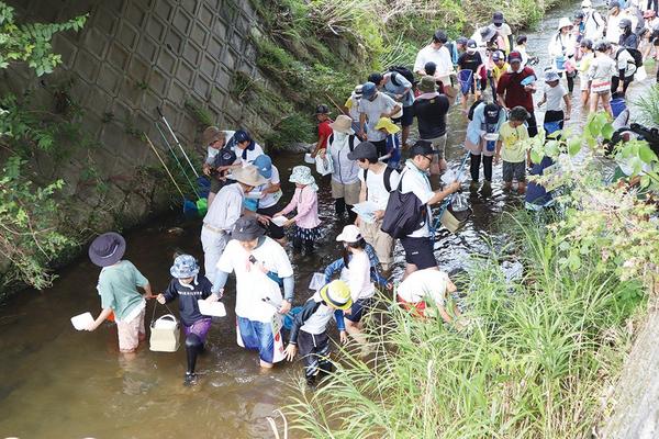 山口県下松市の久保小近くにある切戸川で7月29日、第20回「楽しく見てしっかり知ろう切戸川の自然」が開かれ、22組の親子が川に入って水生生物を探した。 まち...