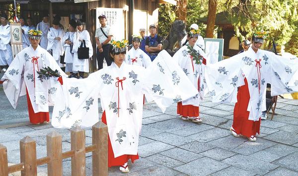【下松】あでやかにみこ舞い奉納 花岡八幡宮・秋季例祭で女子5人