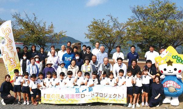 【下松】菜の花と河津桜、青空のコラボを 笠戸島で園児ら種まき