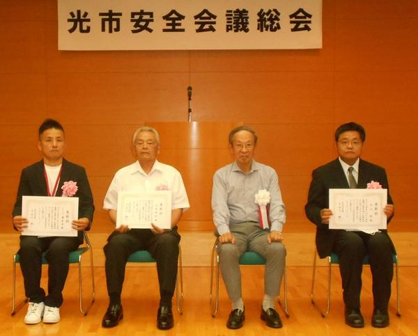 山口県光市安全会議(議長・市川熙市長)の総会が18日、あいぱーく光で開かれ、安全功労者として1団体と3人が表彰された。 総会では市川議長と光警察署の進藤常範...