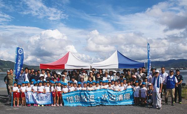 【下松市】園児ら「海岸をきれいにしたよ!」 県釣り協・洲鼻で海岸清掃と稚魚放流