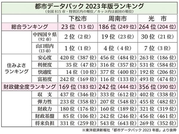 全国の792市と東京都特別区の計815市区の都市力を比較する東洋経済新報社の今年度の「住みよさランキング」が12日に発表され、下松市は23位にランキングされて...