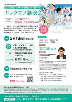 18日・キックオフ講演会 山口県周南市の周南公立大学(高田隆学長)の地域健康交流研究センターキックオフ講演会が、18日(土)午後1時半から周南市役所1階の多目...