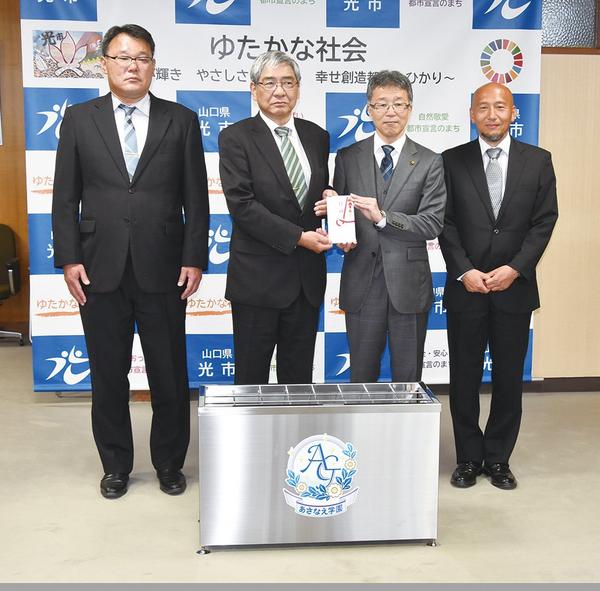 2月に創立30周年を迎えた光市島田の㈱ステンレス光(田中和夫社長)が、旧光丘高に移転した浅江中にステンレス傘立て14基を贈り、6日に市役所で受納式が開かれた。...