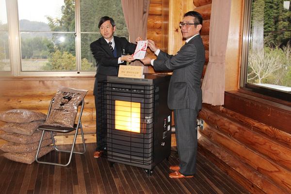 木くずを成形した木質ペレットを燃料とするペレットストーブが27日、農林中央金庫から光市立野の市野外活動センター、周防の森ロッジ(江村松保所長)に贈られ、ログハ...