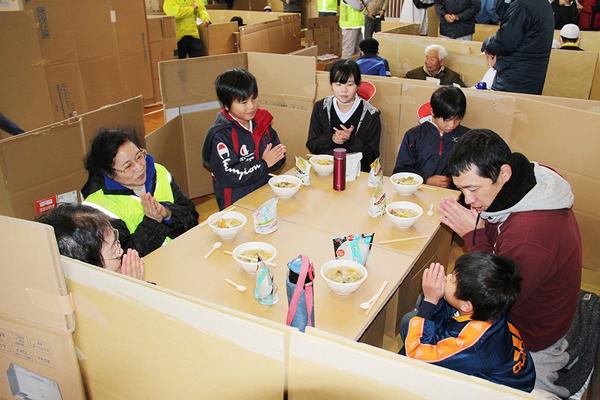 【光市】段ボールで避難所づくり 上島田小で児童と住民200人が防災教室