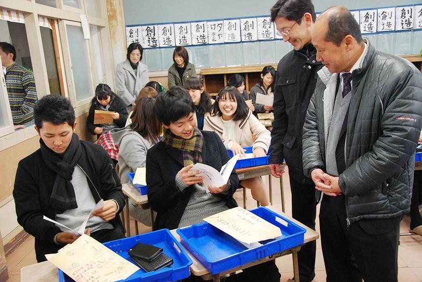 手紙を読んで当時の教員と歓談する新成人