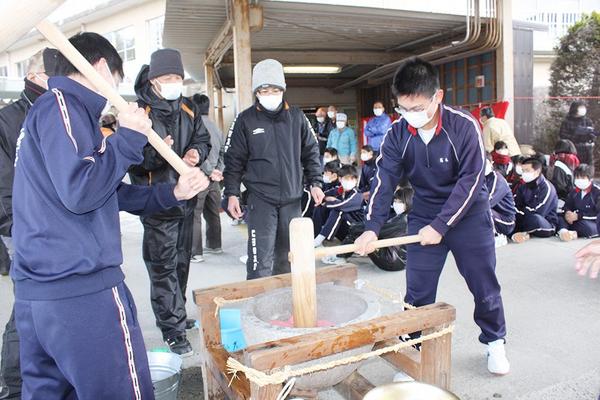 【光市】“粘り”にあやかり合格を 島田中3年生が必勝餅つき