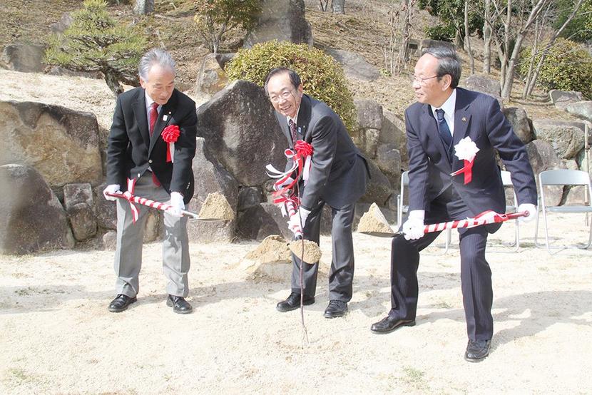 野村モミジを植える左から中村議長、大橋町長、市川市長