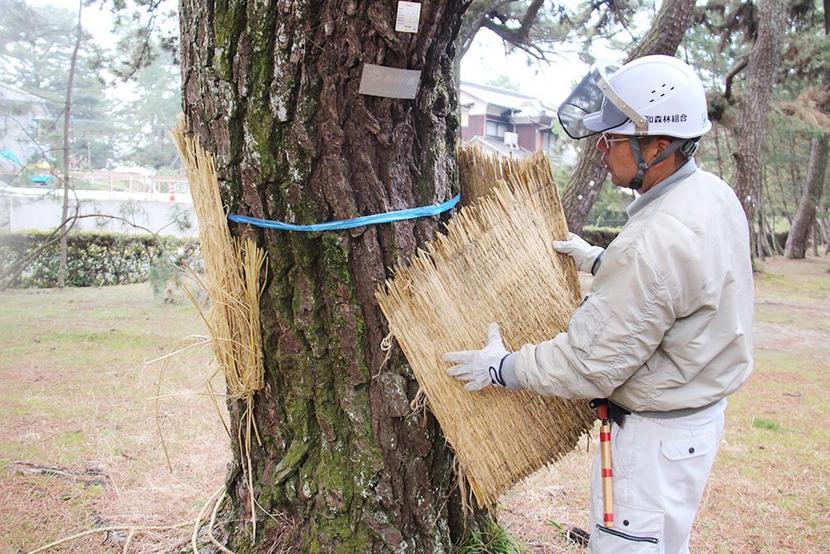 光市の虹ケ浜と室積海岸で3日、松100本に松を枯らす害虫を駆除するために巻かれたわら製の“こも”182枚が、5日の啓蟄(けいちつ)を前に一斉にはずされた。 ...