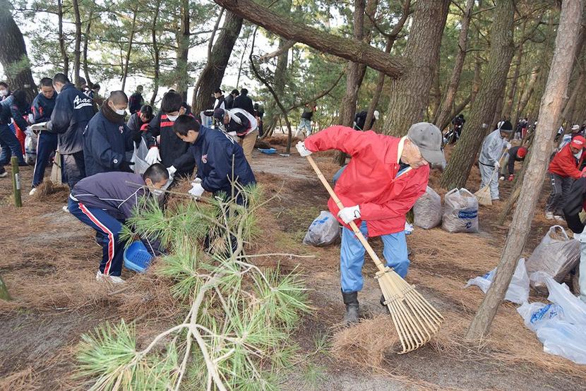 光市の虹ケ浜海岸で21日朝、松林を保全するため浅江中の1、1年生250人と住民など70人がボランティア活動で松の落ち葉が堆積し過ぎないよう、余分な松葉を集めた...
