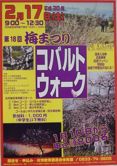 瀬戸内海を見降ろす光市室積の高台の市道“コバルトライン”を歩く第十八回梅まつりコバルトウオークが17日午前9時から市総合体育館出発で開かれることになり、先着8...