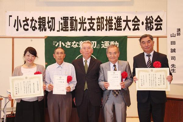 光市の「小さな親切」運動光支部(守田義昭支部長)の推進大会と総会が15日、市教委ホールで開かれ、席上、2人と2団体に「小さな親切」実行章が伝達された。 実行...
