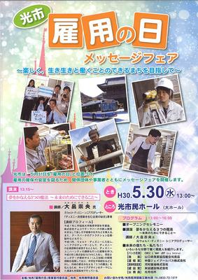 光市は第6回「雇用の日」メッセージフェアを30日午後1時から市民ホール大ホールで開き、ウォルト・ディズニーの元シニアプロデューサー、大畠崇央さんの講演「夢をか...