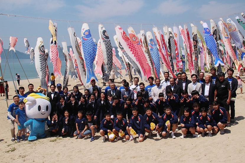 光市の虹ケ浜海水浴場で東日本大震災の被災地の復興を願う“虹の鯉のぼりの下に集う会”が4月29日開かれ、海岸にロープを張って渡した140匹のこいのぼりが泳ぐ下に...