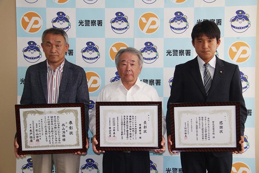 光署は5月30日、同署で、同署少年相談員の光市室積正木の西山満雄さん(60)、花園の斎藤健治さん(69)と、少年リーダーズ活動功労校として聖光高(広川晋校長)...