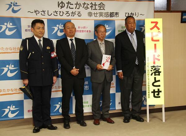 県トラック協会周南支部(大嶋鉄雄支部長、154社)は13日、光市に「とびだし注意」「スピード落とせ」「この先カーブ スピード落とせ」「止まれ 一時停止・左右確...