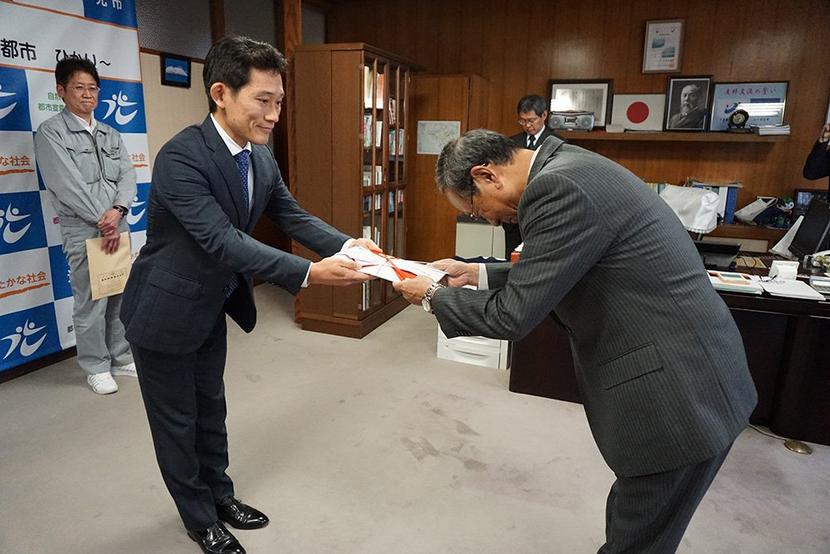 光市浅江の金属線加工業、永岡鋼業は21日、創業75周年を記念して150万円を光市に寄付した。 永岡昌弘社長(44)と永岡栄之会長(75)、宮本裕之常務(59...
