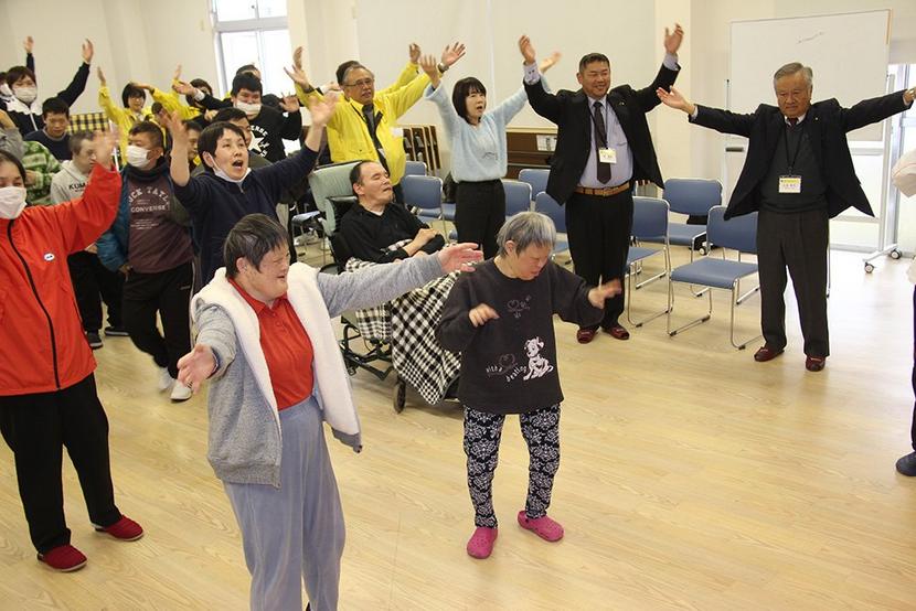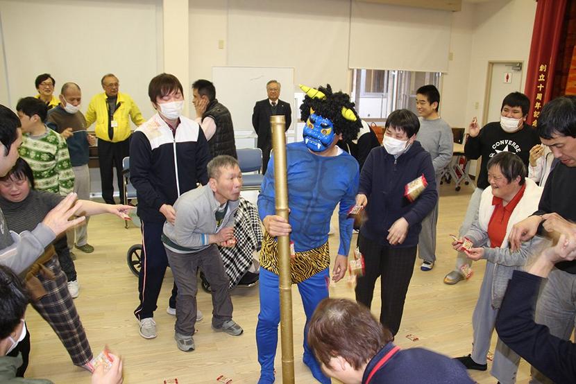 光市の光ライオンズクラブ(48人)の山本哲夫会長ら12人が7日、岩狩の障害者支援施設ひかり苑(国沢宗巌施設長、78人)を訪れ、鬼2匹に扮した会員2人に向かって...