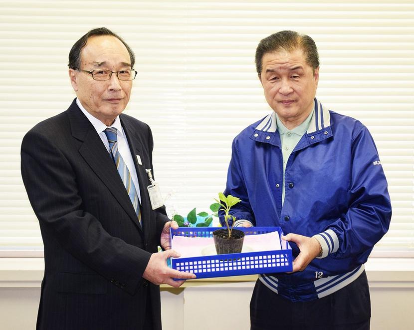 • 苗を持つ能美教育長(左)と河村さん
