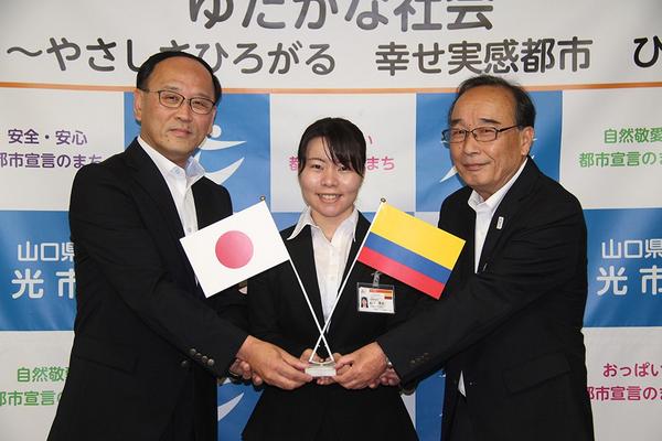 国際協力機構(JICA)の青年海外協力隊員で南米のコロンビアに約2年間派遣される光市の室積小教諭、山下澪奈(れいな)さん(27)が10日、市役所で森重正一副市...