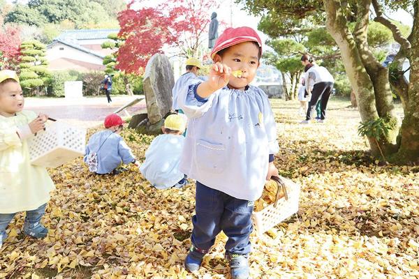 光市束荷の伊藤公記念公園で25日、同市の束荷幼稚園(矢野浩園長)の園児10人が来年1月に販売の「開運イチョウカード」に使うイチョウの落ち葉を拾い集めた。市観光...