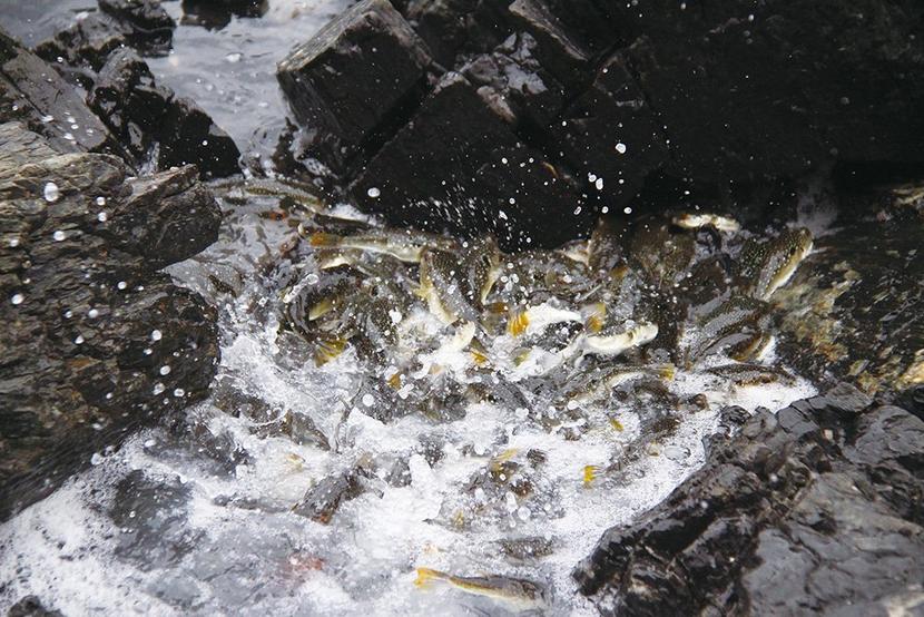 激しいしぶきを上げるクサフグ