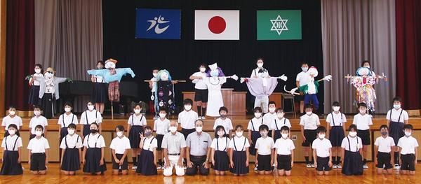 感謝込めて医師やアマビエも 室積小5年がかかし 伊保木の田んぼに7体